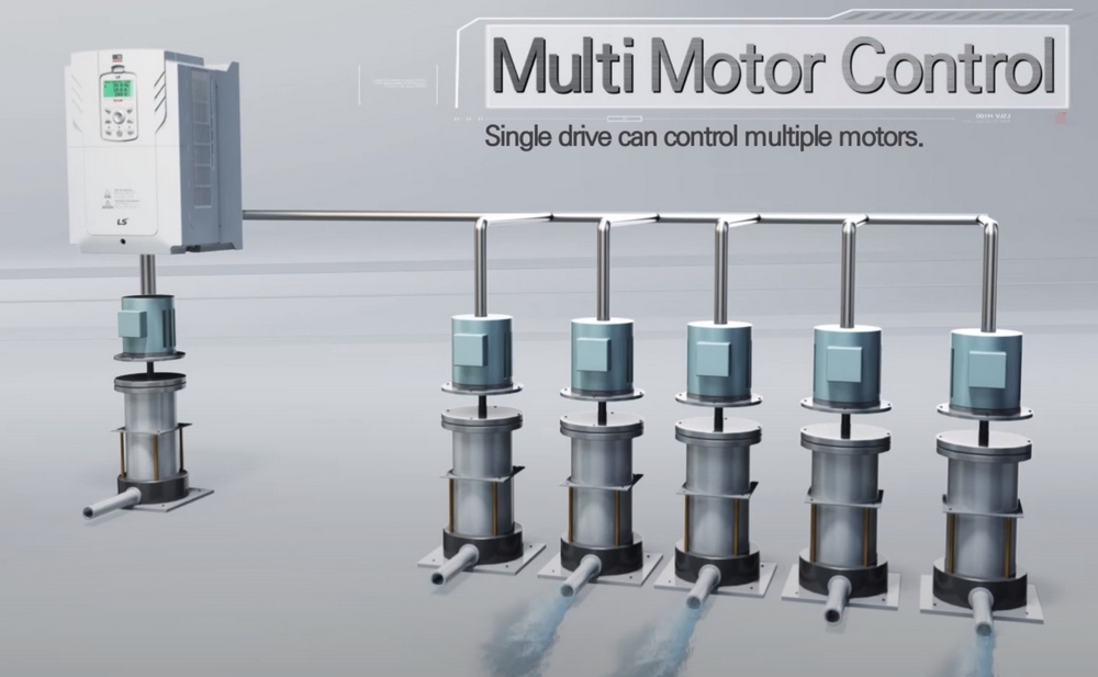 Ud over mange specielle funktioner har H100-frekvensomformeren en "Multi Motor Control"-funktion. Som man kan se på billedet eller i videoen (minut 3:07), kan forskellige pumpemotorer styres samtidigt og på forskellige tidspunkter.
